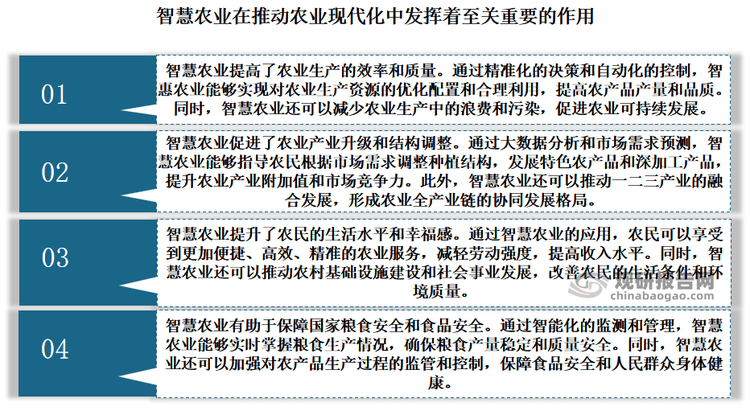 按照不雅研演讲网发布的《中国聪慧农业行业成长深度研究取投资前景预测演讲(2024-2031年)》显示,聪慧农业是现代消息手艺取保守农业深度融合构成的数字化农业体例,是农业的底子出,也是当前国度鼎力成长的财产,正在鞭策农业现代化中阐扬着至关主要的感化。