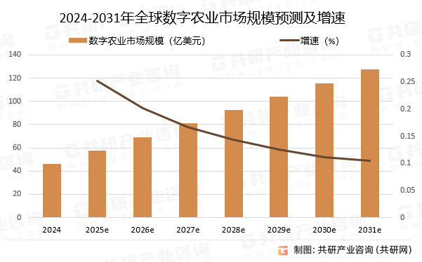 跟着消费者对农产物质量和平安性要求的不竭提高,以及农业现代化和规模化运营的需求添加,数字农业的市场需求持续增加。2024年全球数字农业市场规模达到46。1亿美元,估计2031年数字农业市场规模将达到127。8亿美元,年复合增加率(CAGR)为15。9%(2025-2031)。