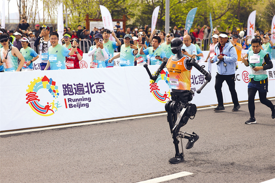 近日,2025亦庄半程马拉松暨人形机械人半程马拉松举行。图为机械人正在角逐中。记者 方 欣 摄。