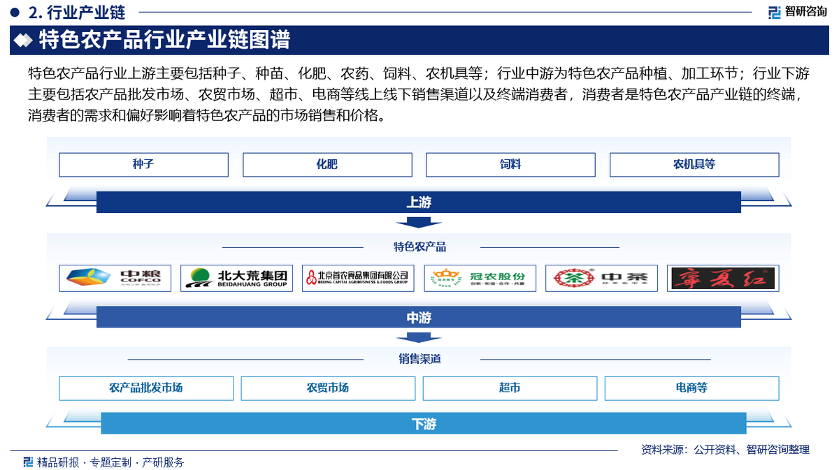 特色农产操行业上逛次要包罗种子、种苗、化肥、农药、饲料、农机具等;行业中逛为特色农产物种植、加工环节;行业下逛次要包罗农产物批发市场、农贸市场、超市、电商等线上线下发卖渠道以及终端消费者,消费者是特色农产物财产链的终端,消费者的需乞降偏好影响着特色农产物的市场发卖和价钱。