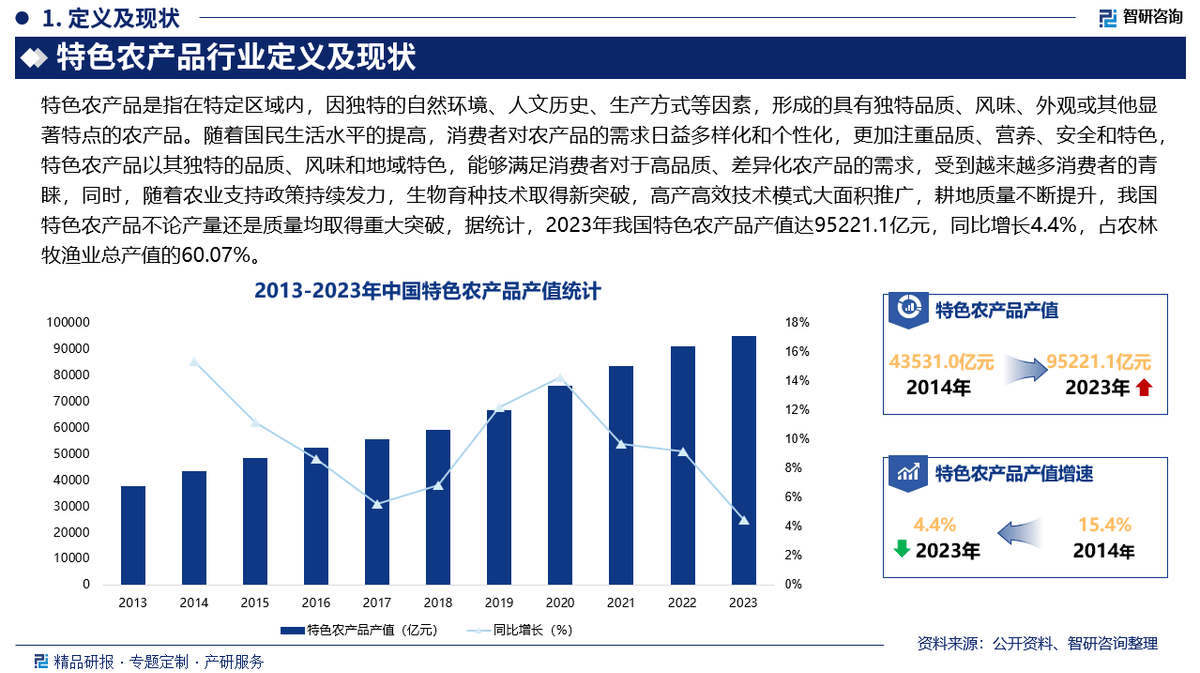 跟着国平易近糊口程度的提高,消费者对农产物的需求日益多样化和个性化,愈加沉视质量、养分、平安和特色,特色农产物以其奇特的质量、风味和地区特色,可以或许满脚消费者对于高质量、差同化农产物的需求,遭到越来越多消费者的青睐,同时,跟着农业支撑政策持续发力,生物育种手艺取得新冲破,高产高效手艺模式大面积推广,耕地质量不竭提拔,我国特色农产物非论产量仍是质量均取得严沉冲破,据统计,2023年我国特色农产物产值达95221。1亿元,同比增加4。4%,占农林牧渔业总产值的60。07%。