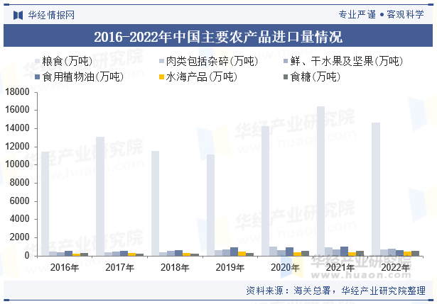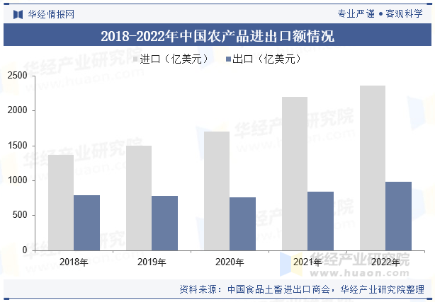 近年来,我国农产物商业总额呈上升趋向,特别农产物进口额上涨趋向更为显著。正在疫情影响最为严沉的2022年,农产物商业照旧连结快速增加态势。我国农产物进出口总额3343。2亿美元,同比增加9。9%,占我国外贸进出口总额5。3%。此中出口982。6亿美元,同比增加16。5%,占我国外贸出口总额2。7%;进口2360。6亿美元,同比增加7。4%,占我国外贸进口总额8。7%;商业逆差1378亿美元,比上年同期扩大1。7%。
